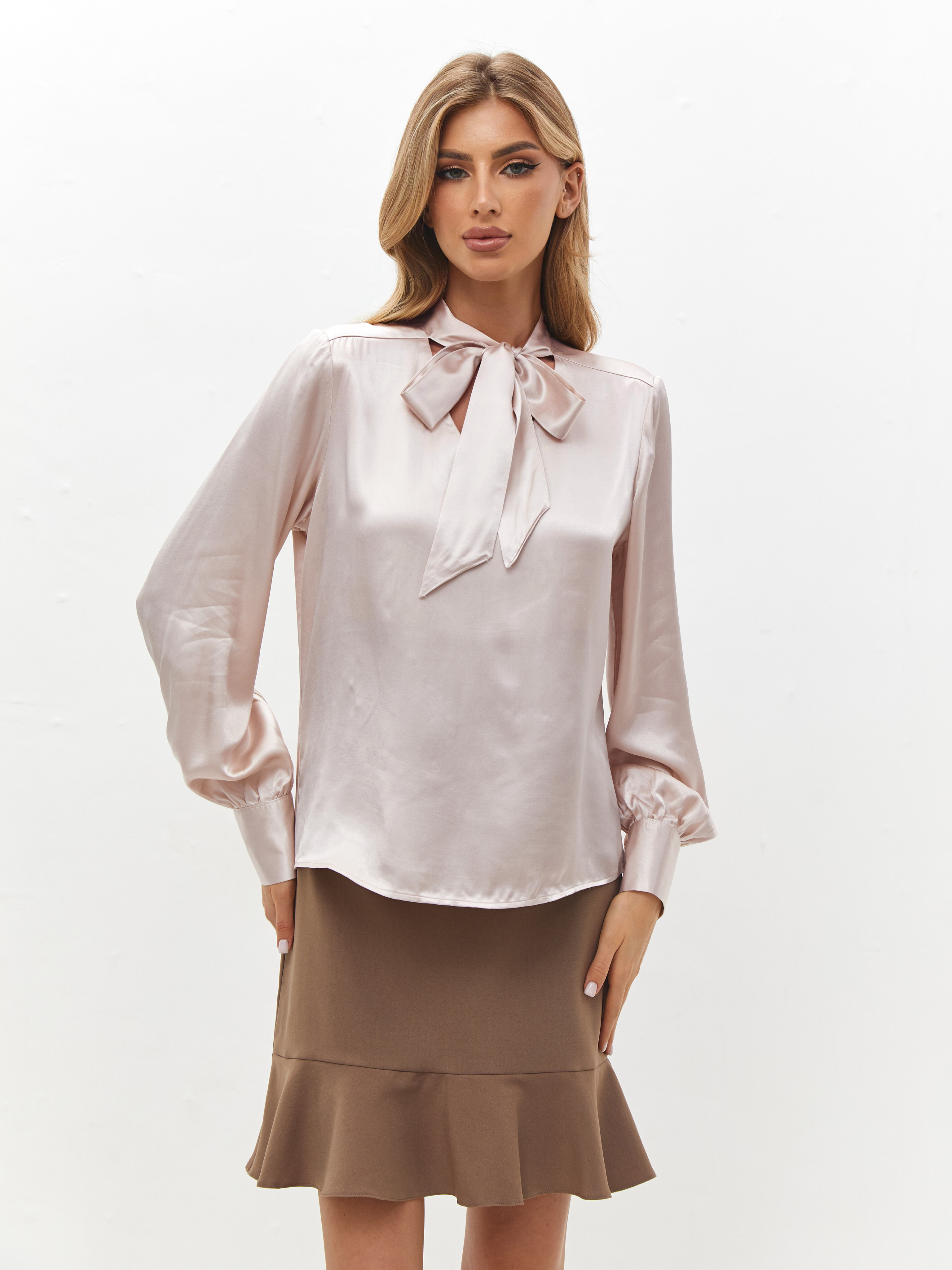 Блузка идеально смотрится с юбкой-карандашом для офиса, классическими брюками для деловых встреч или с юбкой-миди и каблуками для вечернего образа. Минималистичные украшения или серьги-капли подчеркнут утончённость ткани и оттенка примула роза.