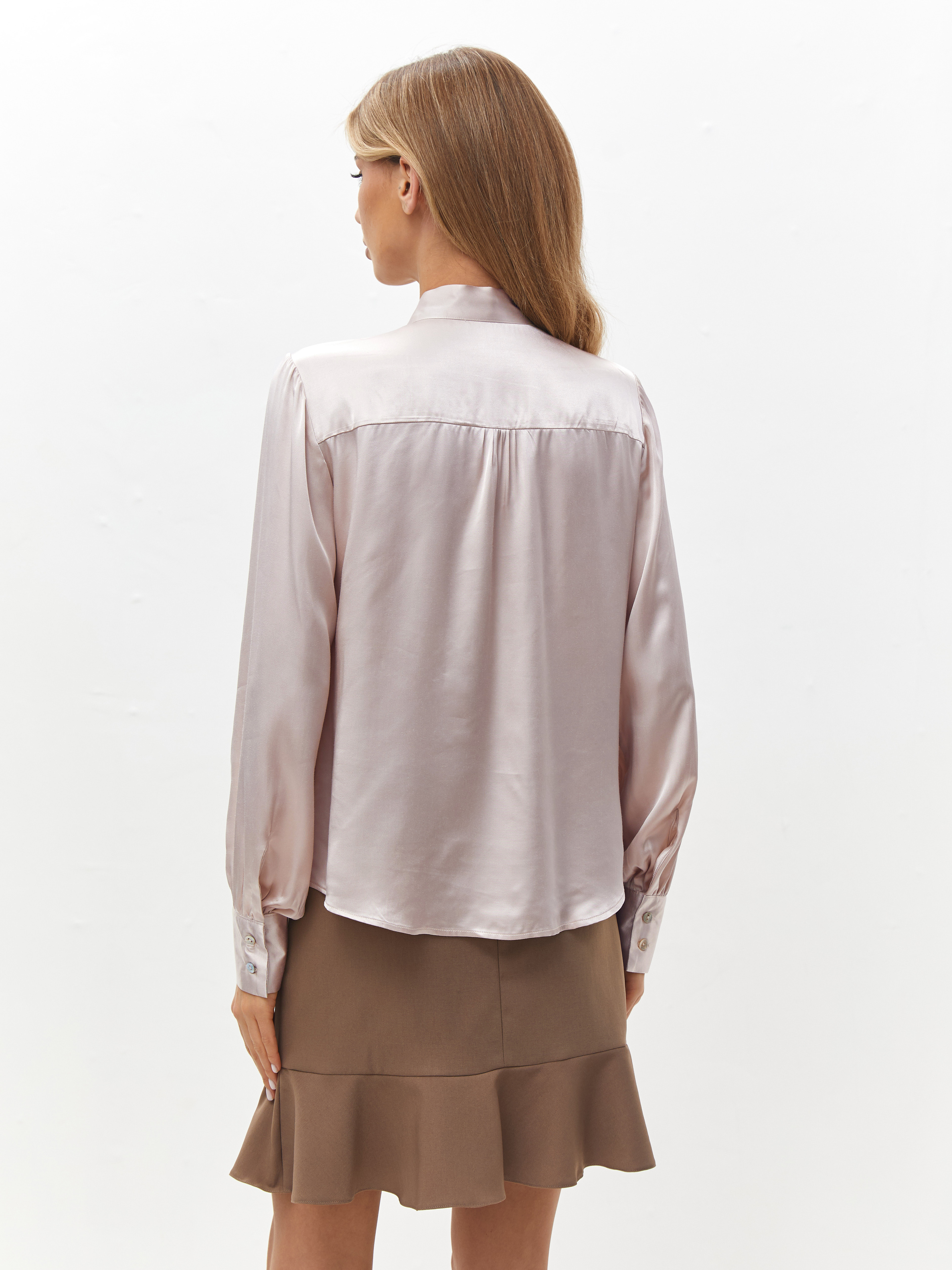 Блузка из итальянского вискозного атласного шелка в оттенке примула роза — воплощение утончённой женственности. Прямой силуэт и V-образный вырез создают лёгкость и изящность, а уникальный воротник с двумя полосками позволяет завязать бант или элегантный галстук, добавляя образу индивидуальности. Рукава «фонарик» с манжетами на пуговицах подчеркивают изысканность и современный шик. Состав: 100% вискоза.